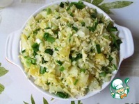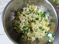 Картофель смешиваем с натертым сыром, мускатным орехом и нарезанной зеленью. У меня был зеленый лук. |