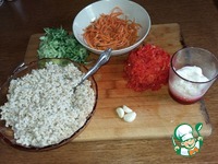 Ставим вариться свеклу и перловку. Тем временем натираем на крупной терке перец и огурец. |