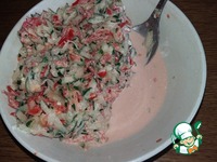 Соединяем перец и огурец, добавляем 1 столовую ложку майонеза, перемешиваем, слегка отжимаем ложкой. |