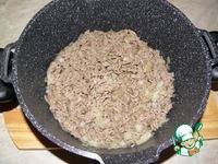 Тщательно и интенсивно перемешать, разбить комочки. Обжаривать лук с фаршем пока фарш не поменяет цвет, приблизительно 3-4 минуты. |