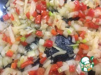 На сковороде разогреть растительное масло, у меня оливковое, и обжарить лук, перец и чеснок буквально минутку. |