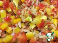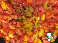 Затем, добавить болгарский перец, помешивая обжарить минуты 3. К обжаренным овощам добавить помидоры. |