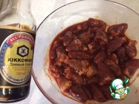 Куриные сердечки замариновать в соевом соусе и томатной пасте, дать постоять 30 минут. |