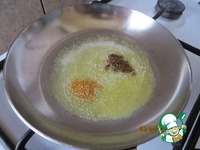 Нагрейте сливочное масло (в идеале гхи), добавьте семена горчицы и кумина. Пассеруйте, пока семена не начнут потрескивать, |
