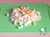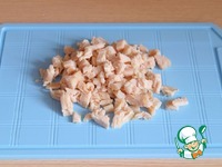 Куриное филе отварить в подсоленной воде, порезать кубиками. |