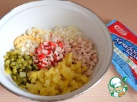 Добавить по вкусу соль и измельченную зелень укропа. Заправить салат майонезом. |