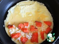 Вылить 2/3 омлетной смеси на смазанную маслом сковороду, на одну половину выложить 1/3 пакетика готового риса Янтарь ТМ «Мистраль» и кусочки малосольной семги. Обжаривать около 1 минуты. |