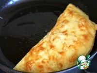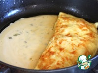Вылить на освободившееся место остатки омлетной смеси, подождать, когда края схватятся, и перевернуть на нее омлет с начинкой. |