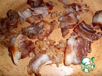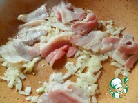 Лук мелко нарезать, бекон нарезать по 4-5 см. Выложить в разогретую с маслом сковороду. |