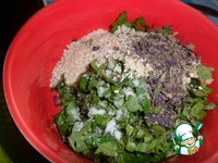 Для соуса: нарезать мяту и зеленый лук, добавить кунжут, соль, оливковое масло, чеснок, базилик (если есть свежий - добавить свежий -10г). |