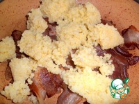 Сваренный пакетик с пшеном вынуть, вскрыть и сразу выложить в сковороду к бекону, пусть немного водички останется, для сочности, перемешать. |