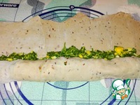 Распределила начинку по листу, оставив один край свободным и свернула рулет. |