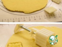 Достать тесто из холодильника, раскатать в пласт толщиной примерно 5 мм и вырезать печенья. |