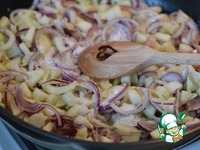 На сковороде разогреть масло, добавить лук и грушу. Добавить сахар. Перемешать. На среднем огне тушить 30 минут. Иногда слегка перемешивать. |
