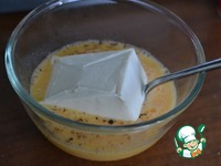 Отдельно вилкой взбить 3 яйца и брынзу ( можно использовать творог). Посолить и поперчить. |