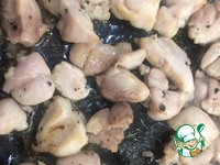 На этой же сковороде обжарить кусочки курицы до золотистого цвета. Предварительно курицу можно посолить. |