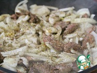 Через 2-3 минуты всыпаем лук, добавляем все специи, соль, сахар и обжариваем, помешивая, 10 минут. Огонь не уменьшаем. |