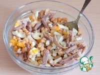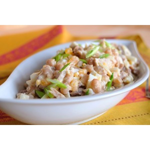 В миску добавить консервированную фасоль (1 бан.), отварные яйца (2 шт.), порезанную брусочками говядину (200 гр.), порезанный мелко репчатый лук. Добавить по вкусу соль. Салат заправить майонезом |