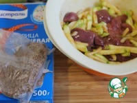 Печень вымыть, обсушить, нарезать на длинные кусочки и добавить к кабачкам. Перемешать. |