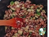 Нарезанные цукини, грибы и репчатый лук обжарить (20 минут). Посолить в процессе приготовления. Слить образовавшуюся жидкость. |