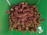 Отварить говяжий язык (у меня уходит на это обычно 2,5 часа). Сваренный язык подержать несколько минут в холодной воде, а затем очистить от шкуры и нарезать его. |