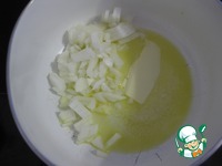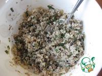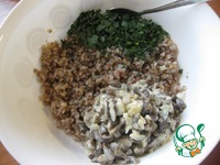 Гречку из пакетика выложить в миску, добавить смесь грибов с луком, зеленый чеснок, соль-перец |