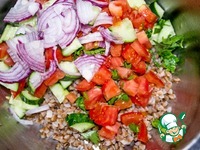 Готовую гречку из пакетика высыпаем в миску, добавляем все овощи и петрушку. |