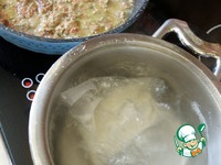 Сворачиваем ленивый «бризоль» пополам. Рис вынимаем и даем ему стечь. Режем "бризоль" на две части. |