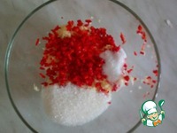 Готовим заправку. Чеснок и острый перец пропустить через мясорубку (я мелко нарезала руками, можно блендером), добавить соль, сахар и уксус. |