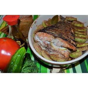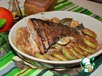 Обжаренную рыбу выложить в огнеупорную форму, обложить кабачками. Добавить пару лавровых листиков, сбрызнуть все оливковым маслом. |