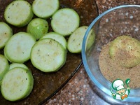 Кабачок вымыть, нарезать на тонкие шайбы. Обмакнуть в маринаде от рыбы. Панировать в сухарях. |