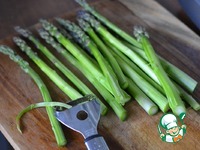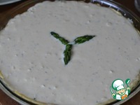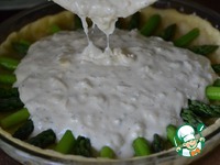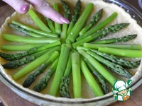 По истечении времени достать корж из духовки и снять бумагу с фасолью Выкладываем спаржу по кругу, если спаржа длиная разрезать ее пополам. |