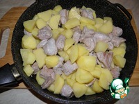 Затем добавить к мясу картофель и обжарить еще 3 минуты на сильном огне. |