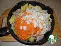 Затем добавить к картофелю с мясом лук с морковью и обжарить вместе пару минут. |