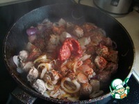 Посолить. Добавить паприку, томатную пасту, тмин. |