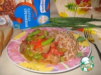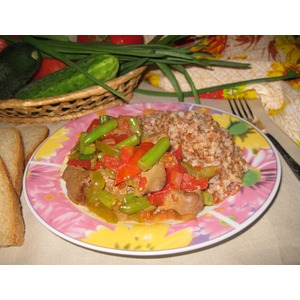 Куриную печень со стручковой фасолью и лечо подавать с рассыпчатой гречкой. |