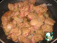 Куриную печень промыть, убрать пленку, нарезать на кусочки. Печень равномерно обжарить на сковороде с разогретым растительным маслом, примерно 6-7 минут. |