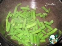 Параллельно в кастрюлю с кипящей водой всыпать стручковую фасоль (не размораживая), варить 5 минут, затем откинуть на дуршлаг. |