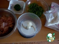 Поставить воду для риса. Тем временем при помощи чаши с ножами или мясорубки перемолоть куриное филе, горошек и шпинат. ( для бОльшей сочности можно добавить солёный огурчик) |