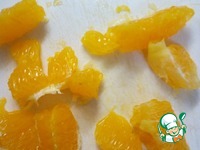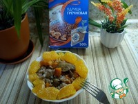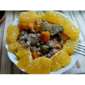Пока гречка варится, а печень и овощи тушатся, чистим второй апельсин и разбираем его на дольки. Пока чистила, сьела половину. |