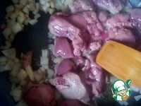 К луку добавляем печень и также обжариваем, помешивая, 2 минуты. |
