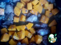 Уменьшаем огонь, закрываем крышку и тушим 5 минут. После чего добавляем обжаренную тыкву. Заливаем приготовленным соусом, доводим до кипения и продолжаем тушение еще в течение 10 минут. |