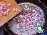 Пока варится капуста, нарезаем мелко ветчину (варёную колбасу, сосиски, сардельки). Высыпаем на достаточно большую сковороду и обжариваем на среднем огне. |