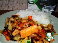 Добавляем капусту в сковородку, хорошенько все перемешиваем. Солим, перчим по вкусу. Накрываем крышкой и даем минуты 2 потушится. В это время достаем рис из кастрюли и выкладываем рис на тарелочки. |
