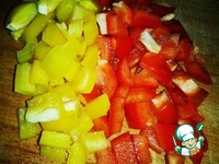 Перец нарезаем кубиками и добавляем в сковородку. |