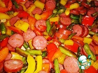 Все хорошенько перемешиваем, добавляем любимые специи (я добавила соль и перец). Солить нужно немного, так как колбаски будут тоже подсоленные. |