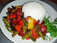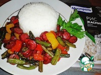 Выкладываем на тарелку рис и колбаски с овощами. |
