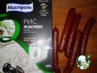 Нарезаем колбаски, добавляем в сковородку. Перемешиваем. Крышкой я не накрываю. Достаем пакетики риса с кастрюли. |