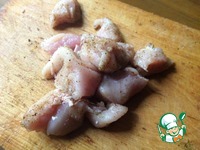 Куриное филе нарезать небольшими кубиками, посолить, посыпать приправой. Перемешать. |