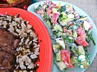 Также я подала к блюду простой каждодневный салатик из помидоров, огурцов, зелёного лука и сметаны. |